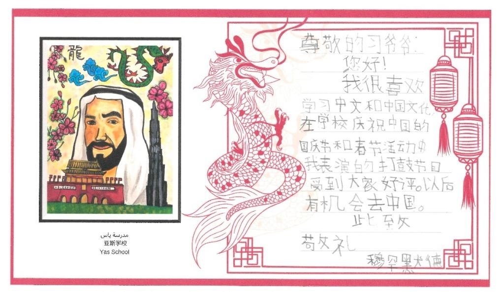 在5年級(jí)學(xué)生穆罕默德的畫筆下,北京天安門和迪拜哈利法塔并排而立,四周鮮花盛開。這個(gè)多才多藝的男孩在信中告訴習(xí)爺爺,自己很喜歡學(xué)中文和中國文化,學(xué)校組織了春節(jié)、中國國慶等活動(dòng),他表演的打鼓受到好評(píng)。他期待“以后有機(jī)會(huì)去中國”。