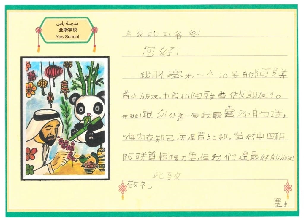 10歲的塞夫就讀于阿聯(lián)酋規(guī)模最大的公立學(xué)校亞斯學(xué)校。他在信中與習(xí)爺爺分享自己最喜歡的一句中國古詩——“海內(nèi)存知己,天涯若比鄰”,因?yàn)椤半m然中國和阿聯(lián)酋相隔萬里,但我們是最好的朋友!”
