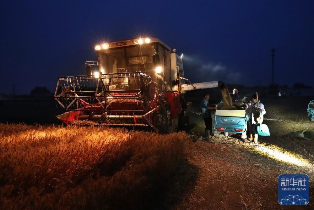 5月25日,河南省周口市商水縣湯莊鄉(xiāng)吳樓村村民在搶收小麥。新華社發(fā)(高建中攝)