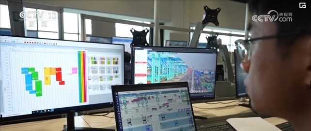 作為系統(tǒng)優(yōu)化師,范春奇全神貫注地盯著3個(gè)屏幕。左邊屏幕是碼頭調(diào)度指令,右邊是現(xiàn)場(chǎng)監(jiān)控的實(shí)時(shí)畫面,中間是智能水平運(yùn)輸系統(tǒng),顯示著所有車輛的運(yùn)行軌跡。
