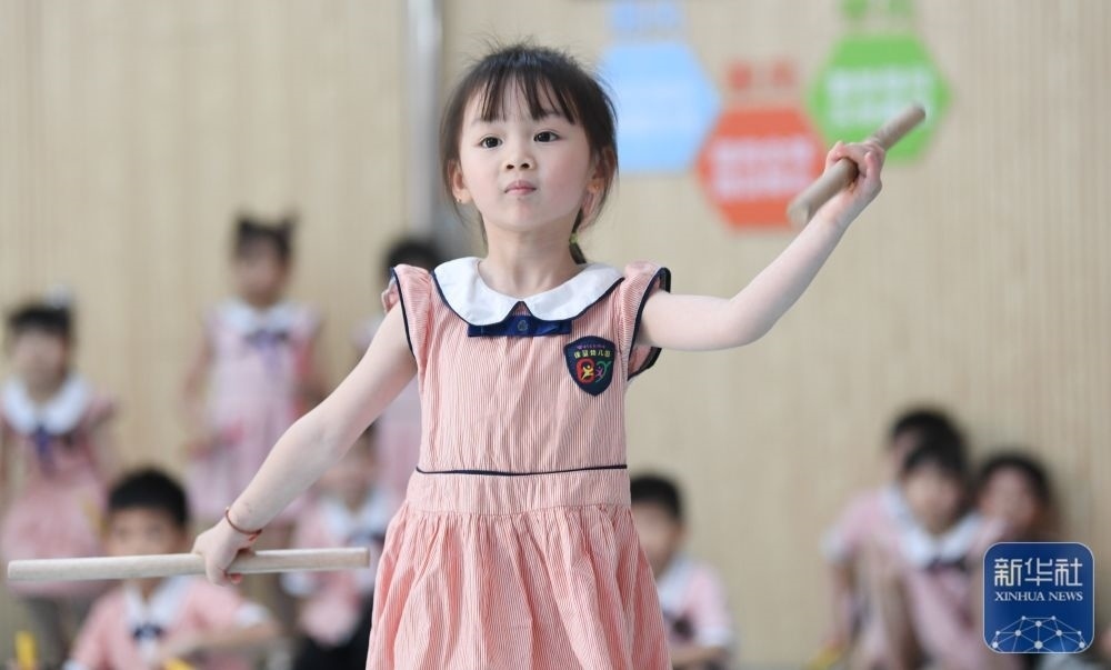 5月29日,在汕頭市貴嶼鎮(zhèn)北林保嬰幼兒園,莊恩琪練習跳英歌舞。