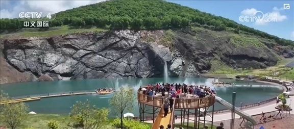 在黑龍江雙鴨山的翡翠湖礦坑公園,藍(lán)綠色湖水在陽(yáng)光照耀下如詩(shī)如畫(huà)。游客們身處山野間,感受著自然之美和夏日清涼。