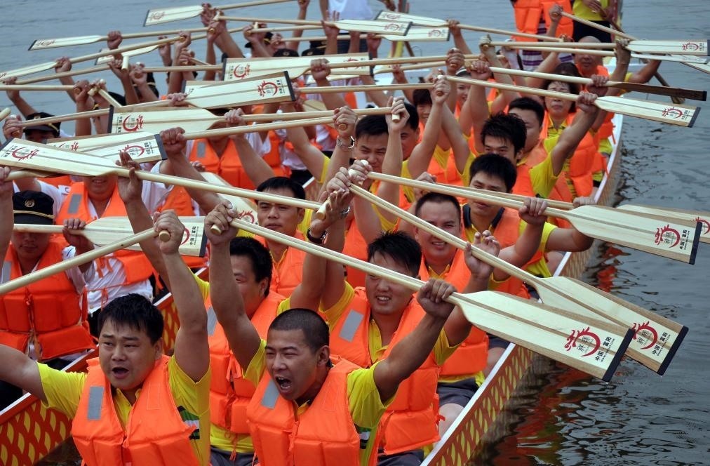 2011年6月6日,在河南省鄭州東區(qū)的如意湖上,舉行了一場龍舟挑戰(zhàn)賽,兩支龍舟隊的選手們在比賽開始前舉槳大吼以壯氣勢。