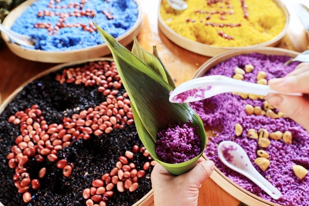 2022年5月25日,在廣西融安縣雅瑤鄉(xiāng)章口村西古坡屯,壯族村民在制作五彩粽,這是用山上生長的紅藍草、蘇木等植物煮水取汁后將糯米染色制成的。