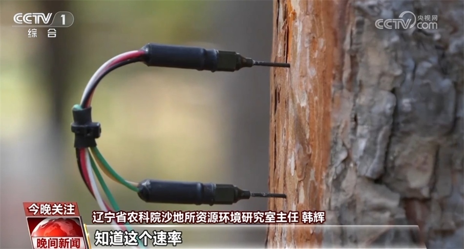 記者在采訪時看到,一棵樹的樹干上插了兩根探針,據(jù)遼寧省農(nóng)科院沙地所資源環(huán)境研究室主任韓輝介紹,這是用來監(jiān)測樹干水分的。通過監(jiān)測兩根探針之間的溫差,他們就能夠計算出這棵樹的液流速率。知道這個速率,他們就可以了解這棵樹的生長狀態(tài),這個實驗的最終目的,是想得出在單位面積上到底有多少棵樟子松最合理。