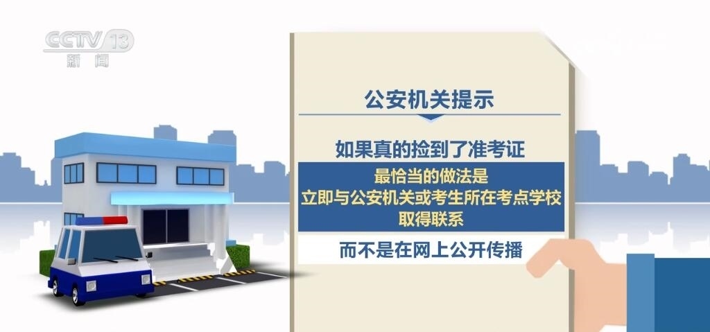 公安機關(guān)提示:如果真的撿到了準考證,最恰當?shù)淖龇ㄊ橇⒓磁c公安機關(guān)或考生所在考點學(xué)校取得聯(lián)系,而不是在網(wǎng)上公開傳播。另外,如果看到此類信息的網(wǎng)友,未經(jīng)核實的情況下不轉(zhuǎn)發(fā)、不跟貼、不評論,不撥打相關(guān)聯(lián)系電話,謹防上當受騙。