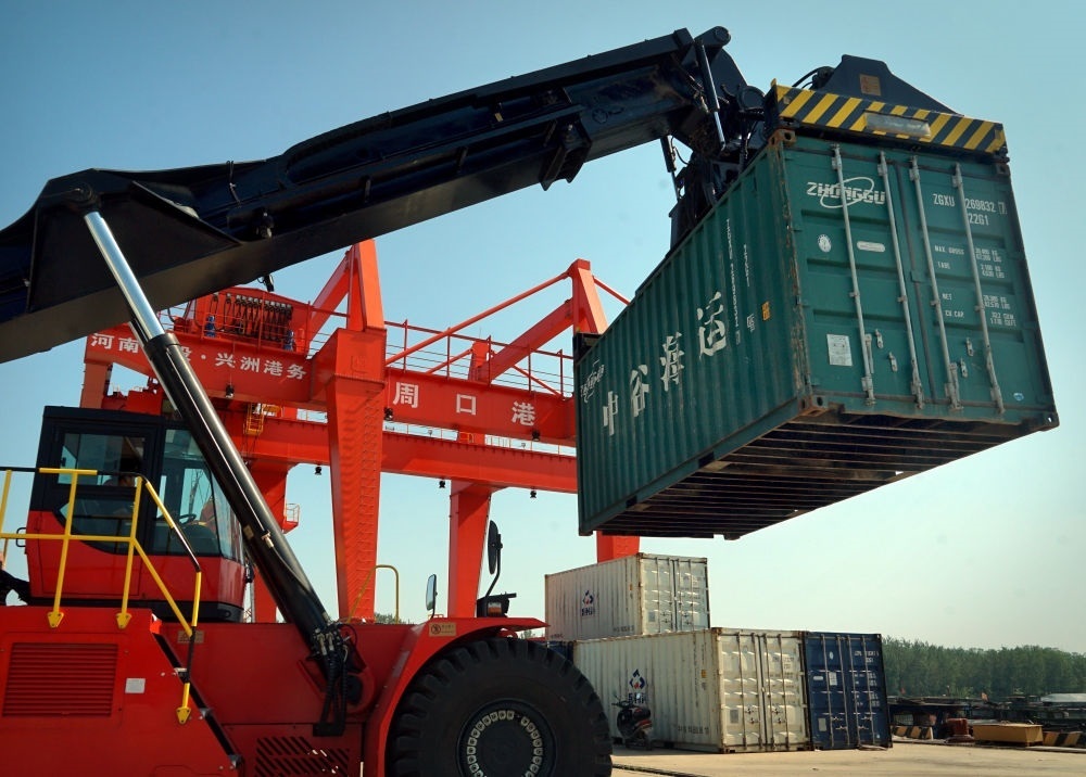 2020年8月27日,工人操作機械設(shè)備在河南周口中心港碼頭進行吊裝作業(yè)。