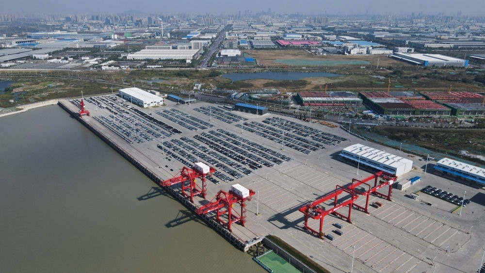 2024年5月26日,在安徽蕪湖港朱家橋港區(qū)國際集裝箱碼頭,整齊排列的汽車等待出口(無人機照片)。作為安徽省首個國家一類開放口岸,蕪湖港現(xiàn)已發(fā)展成為長三角城市群綜合交通運輸體系的重要樞紐。