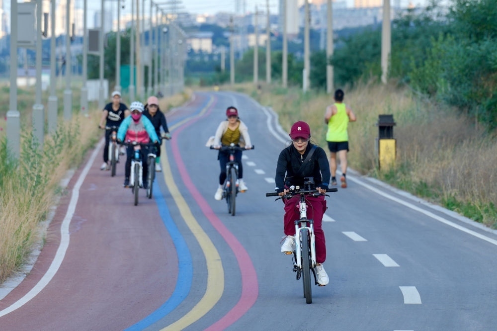 2024年6月5日,人們?cè)谶\(yùn)城鹽湖環(huán)湖步道上騎行。