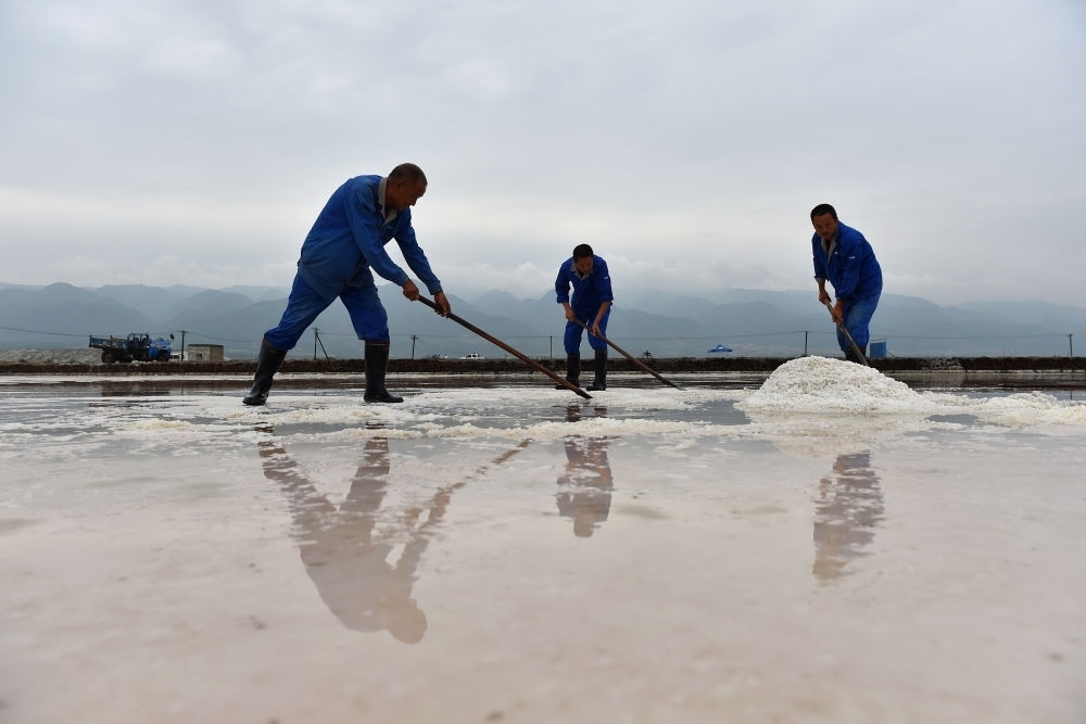 2016年8月25日,工人在運(yùn)城鹽湖進(jìn)行扒鹽作業(yè)。