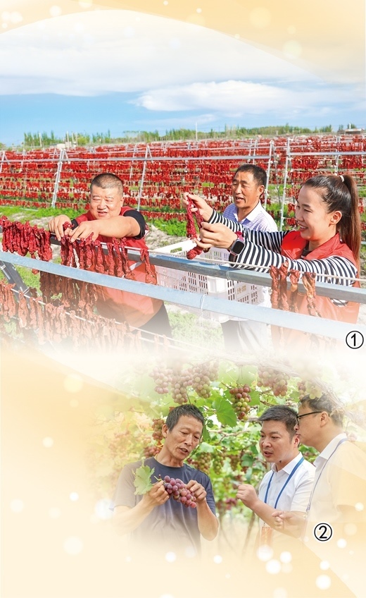 圖①:新疆維吾爾自治區(qū)博湖縣塔溫覺(jué)肯鄉(xiāng)辣椒曬場(chǎng)上,黨員志愿服務(wù)隊(duì)幫助村民晾曬辣椒。年 磊攝 圖②:浙江省淳安縣紀(jì)檢監(jiān)察干部走訪(fǎng)果農(nóng),聽(tīng)取意見(jiàn)建議。謝航凱攝