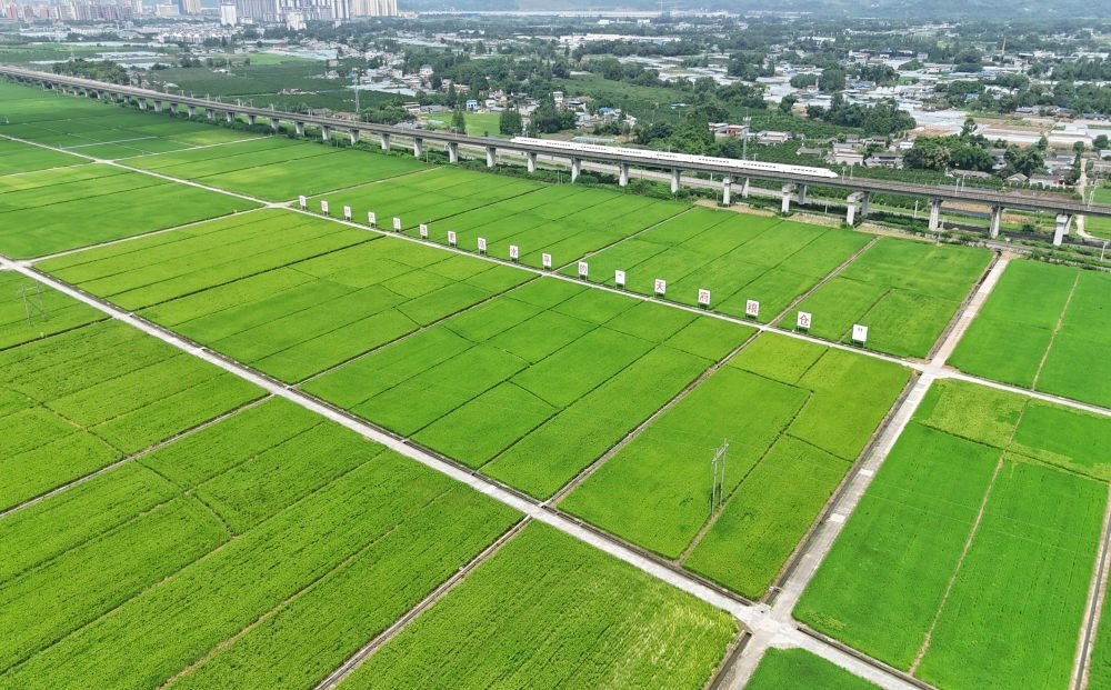 2024年7月26日,一列高鐵列車從永豐村高標準農田上方的高架橋上疾馳而過(無人機照片)。