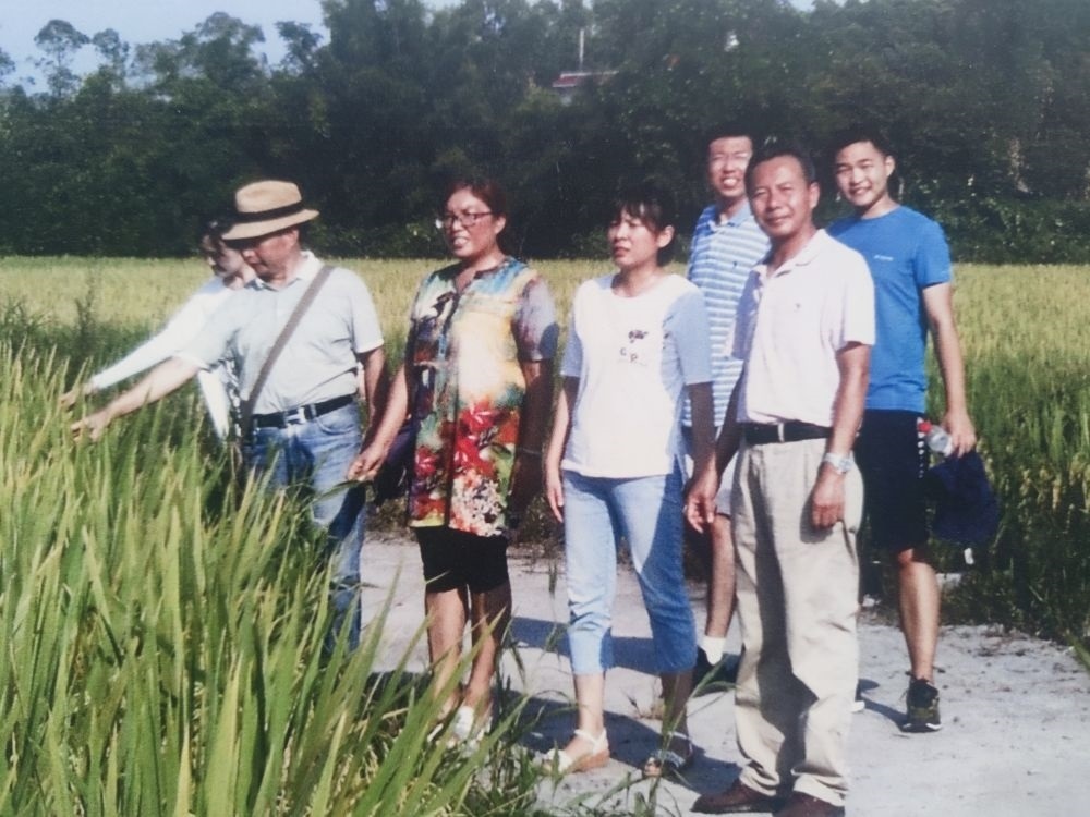 2014年,馬均(右二)帶領學生在永豐村與當?shù)剞r技人員交流。