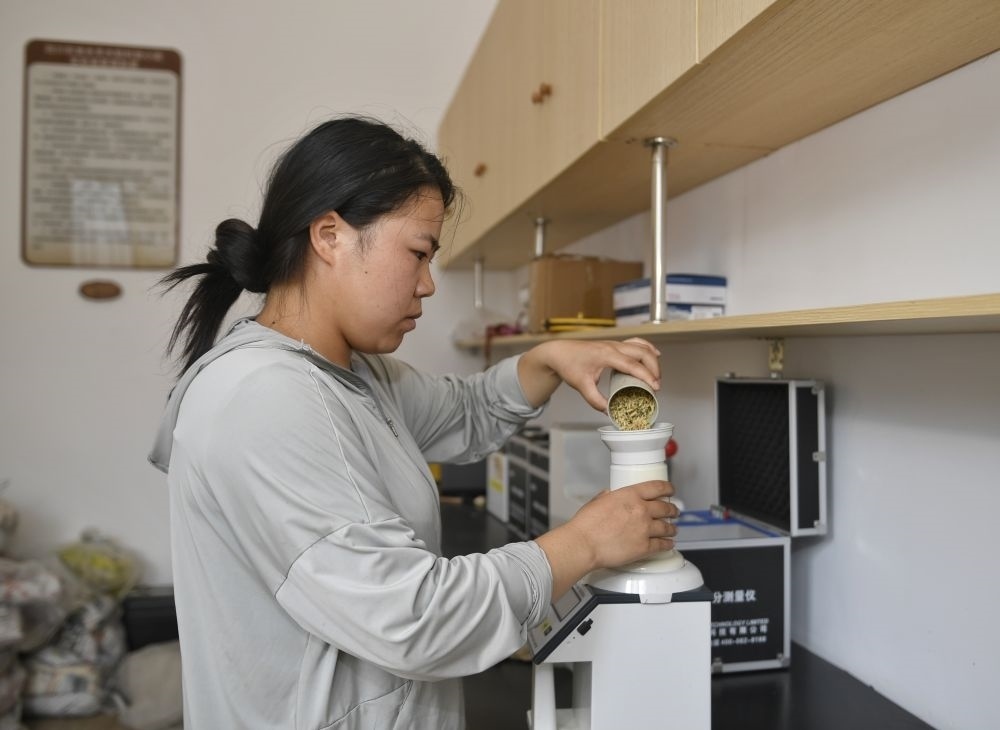 2024年8月22日,在永豐村水稻科技小院,長期駐守在此的四川農業(yè)大學學生測量稻谷含水量。