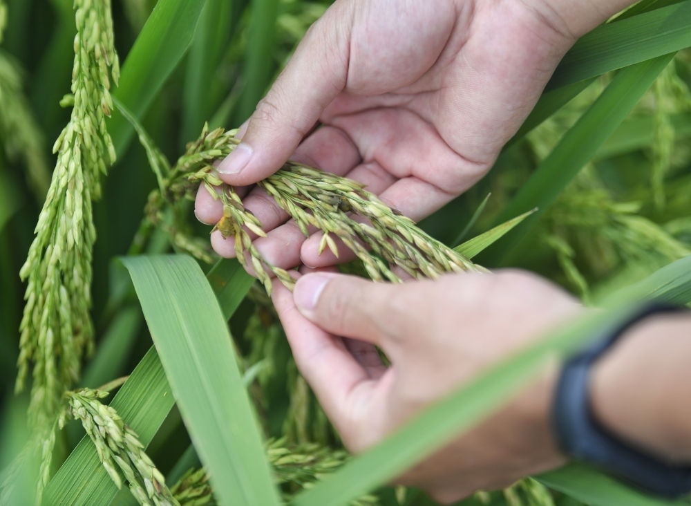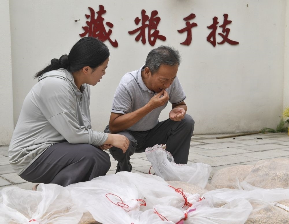 2024年9月10日,農業(yè)專家、四川農業(yè)大學教授馬均(右)在永豐村水稻科技小院通過牙咬感受稻谷晾曬程度。