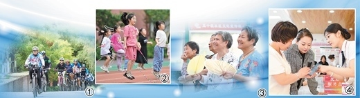 圖①:河北邯鄲市復(fù)興區(qū)沁河源景區(qū),騎行愛好者在騎行。聶長(zhǎng)青攝 圖②:河南洛陽市瀍河回族區(qū)君河灣小學(xué),暑期托管班的學(xué)生在跳繩。李衛(wèi)超攝 圖③:安徽合肥市蜀山區(qū)小廟鎮(zhèn)五十墩社區(qū)文化廣場(chǎng),村民在看戲曲演出。陳三虎攝 圖④:內(nèi)蒙古鄂爾多斯市康巴什區(qū)寧馨社區(qū)政務(wù)便民服務(wù)站,工作人員幫居民辦業(yè)務(wù)。王 正攝
