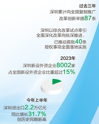 改革開放釋放澎湃動(dòng)能。深圳發(fā)布支持外商投資生物醫(yī)藥領(lǐng)域、實(shí)施跨境貿(mào)易投資高水平開放政策試點(diǎn)等20條措施,出臺(tái)優(yōu)化國際化營商環(huán)境工作方案,持續(xù)提升對(duì)全球優(yōu)質(zhì)要素資源的強(qiáng)大吸引力。去年全年,深圳新設(shè)外資企業(yè)8002家,占全國新設(shè)外資企業(yè)比重超過15%;今年上半年,深圳進(jìn)出口總額2.2萬億元,同比增長31.7%,創(chuàng)深圳歷史同期新高。