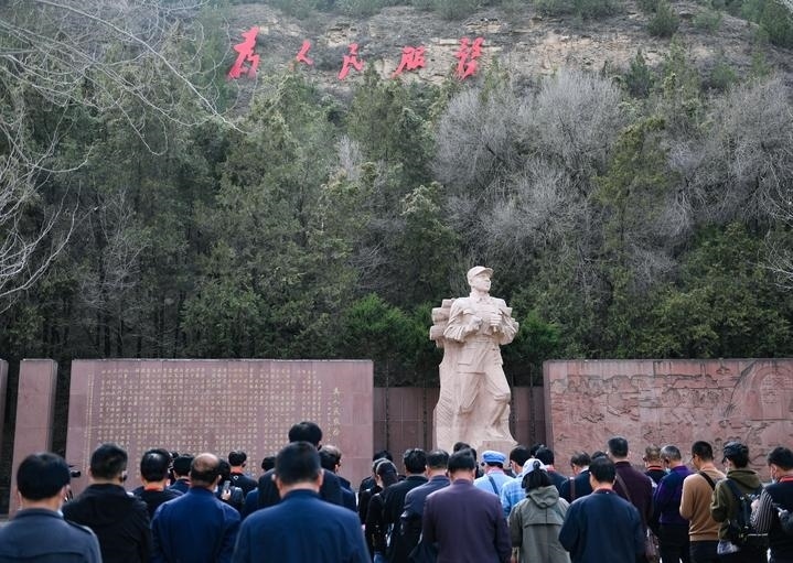 參觀者在延安棗園《為人民服務(wù)》講話紀念廣場參觀。新華社記者 張博文 攝