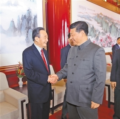 2021年7月1日,慶祝中國共產(chǎn)黨成立100周年大會(huì)在北京天安門廣場隆重舉行。這是慶祝大會(huì)前,習(xí)近平同志與吳邦國同志握手。新華社記者 鞠 鵬攝
