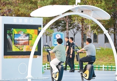 | 在內蒙古自治區(qū)鄂爾多斯市康巴什區(qū)智慧體育公園,市民使用智慧騎行器械健身。王 正攝(人民視覺) |