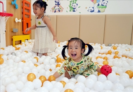 上海市靜安區(qū)江寧路街道社區(qū)黨群服務(wù)中心內(nèi)的“寶寶屋”,小朋友們在玩耍(2022年9月27日攝)。新華社記者 劉穎 攝