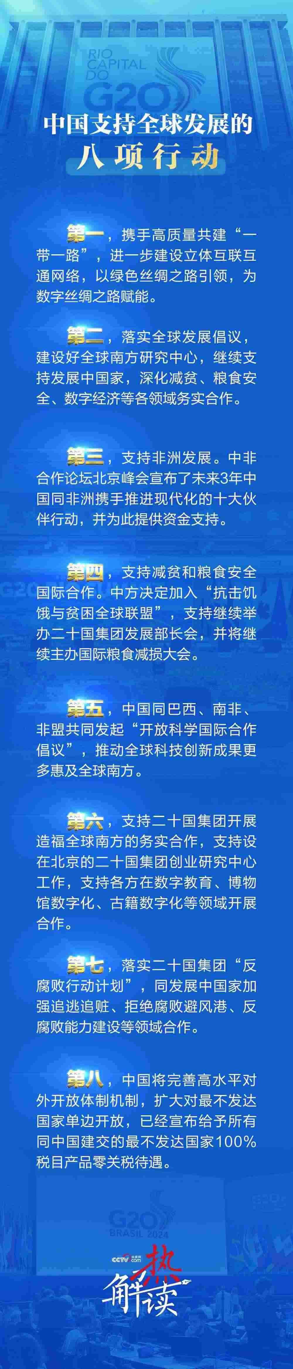 在二十國集團領(lǐng)導(dǎo)人第十九次峰會第一階段會議上,習(xí)近平主席發(fā)表重要講話,宣布中國支持全球發(fā)展的八項行動。