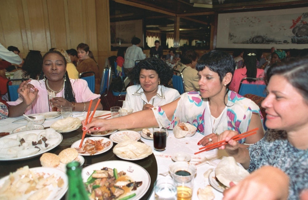 1995年9月10日,來華參加世界婦女大會(huì)的巴西代表結(jié)伴來到北京和平門全聚德烤鴨店,品嘗北京烤鴨。