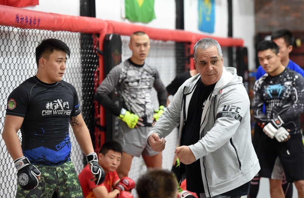 2019年11月6日,來自巴西里約熱內(nèi)盧的柔術(shù)教練魯伊·梅內(nèi)賽斯在北京一家搏擊館講解動(dòng)作要領(lǐng)。