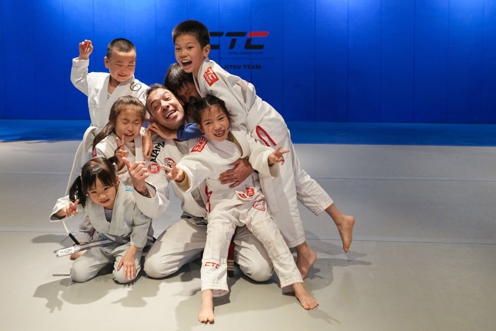 2023年4月7日,在北京一家格斗館內(nèi),巴西柔術(shù)教練席爾瓦(中)在一堂柔術(shù)課結(jié)束后與學(xué)生們合影留念。為了更好地了解中國(guó)和傳統(tǒng)武術(shù),席爾瓦于2016年來到北京,在一家格斗館擔(dān)任巴西柔術(shù)教練。