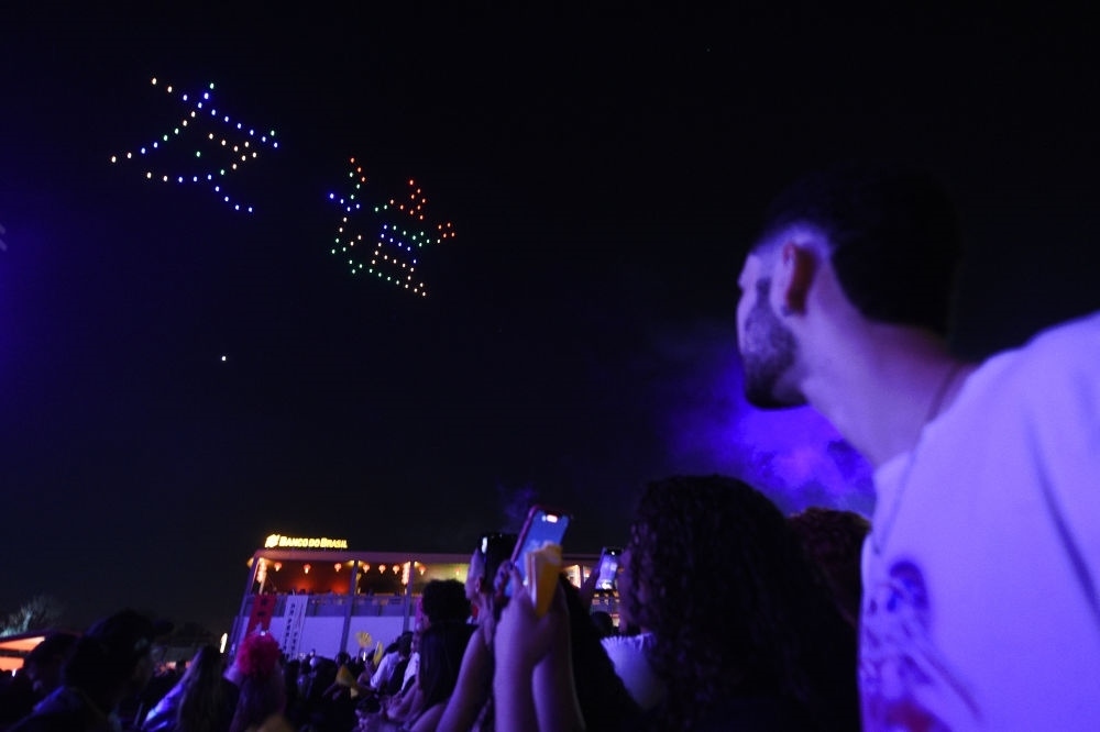 2024年8月17日,在巴西首都巴西利亞,人們?cè)谏碁┧囆g(shù)節(jié)中國(guó)日活動(dòng)上觀看無人機(jī)表演。