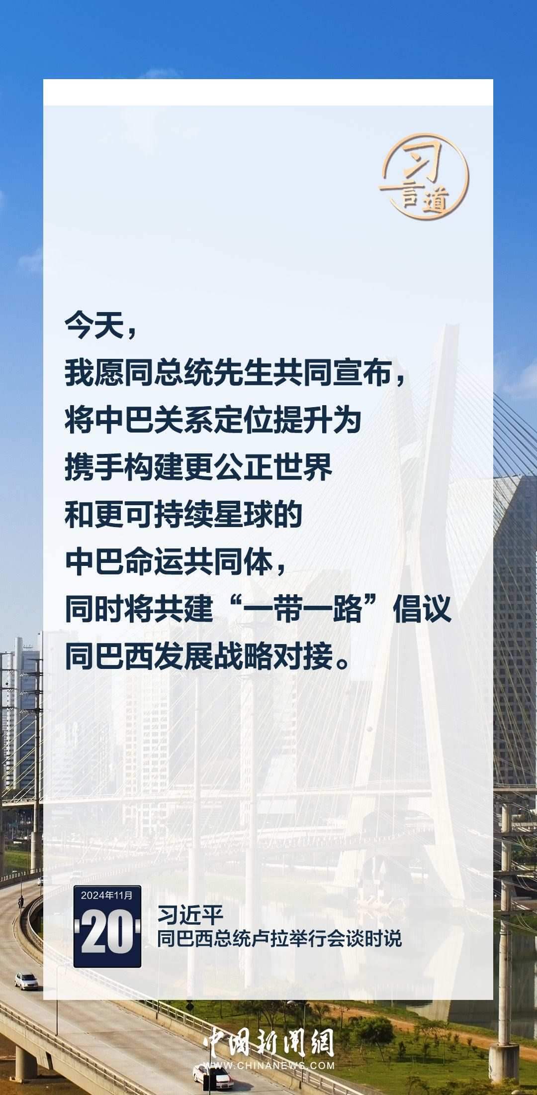 當(dāng)?shù)貢r(shí)間11月20日,中國(guó)國(guó)家主席習(xí)近平在巴西利亞總統(tǒng)官邸同巴西總統(tǒng)盧拉舉行會(huì)談。習(xí)近平指出——