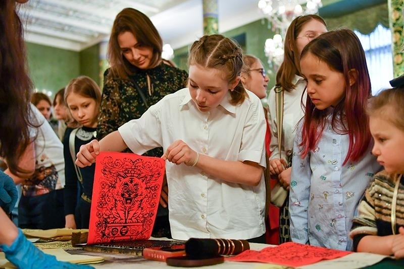 2023年6月2日,在位于俄羅斯莫斯科的中國駐俄羅斯大使館舉行的一場(chǎng)中國傳統(tǒng)文化體驗(yàn)活動(dòng)上,一名小朋友體驗(yàn)雕版印刷。