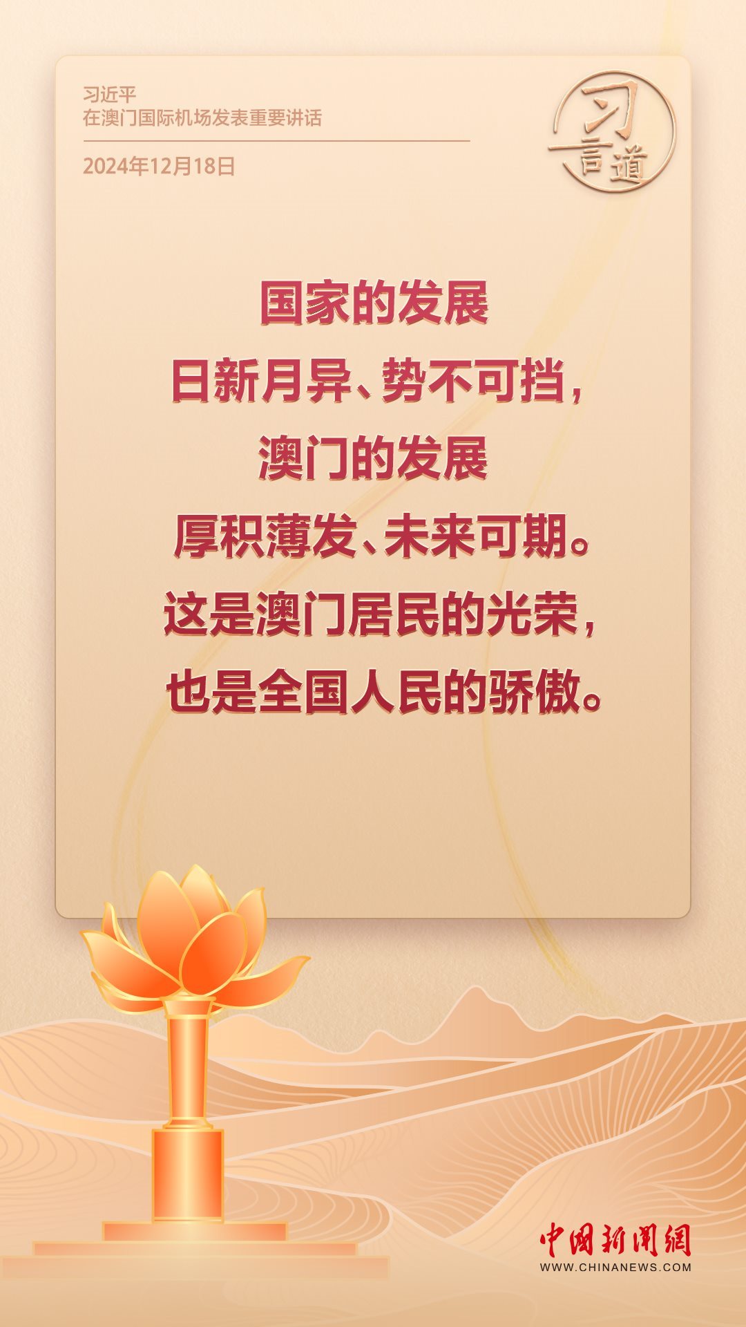 2024年是澳門回歸祖國(guó)25周年。多年來(lái),習(xí)近平主席始終關(guān)注澳門經(jīng)濟(jì)社會(huì)發(fā)展、百姓福祉,寄語(yǔ)“澳門的發(fā)展厚積薄發(fā)、未來(lái)可期”。