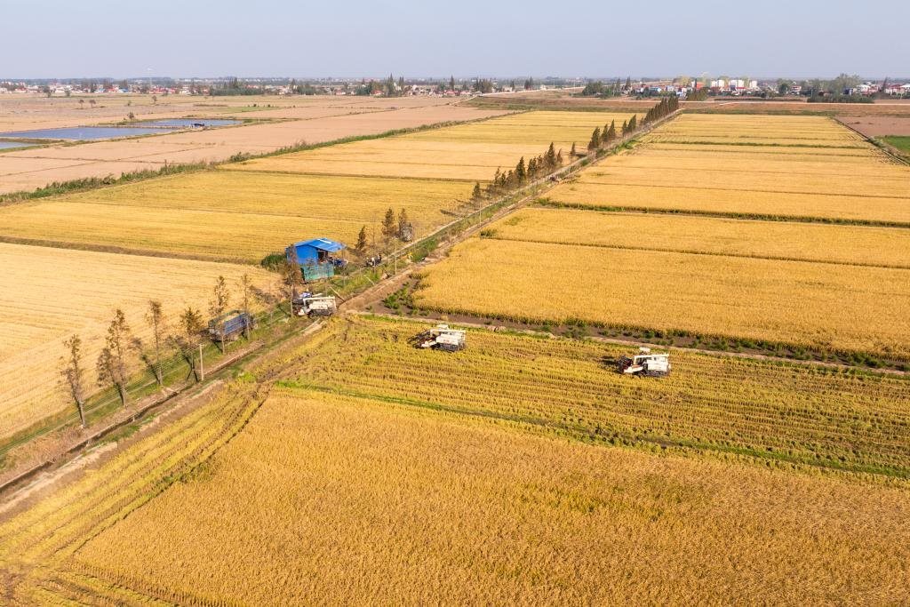在湖南省岳陽(yáng)市華容縣團(tuán)洲垸,村民駕駛收割機(jī)收獲水稻(2024年11月1日攝,無(wú)人機(jī)照片)。新華社記者 陳思汗 攝