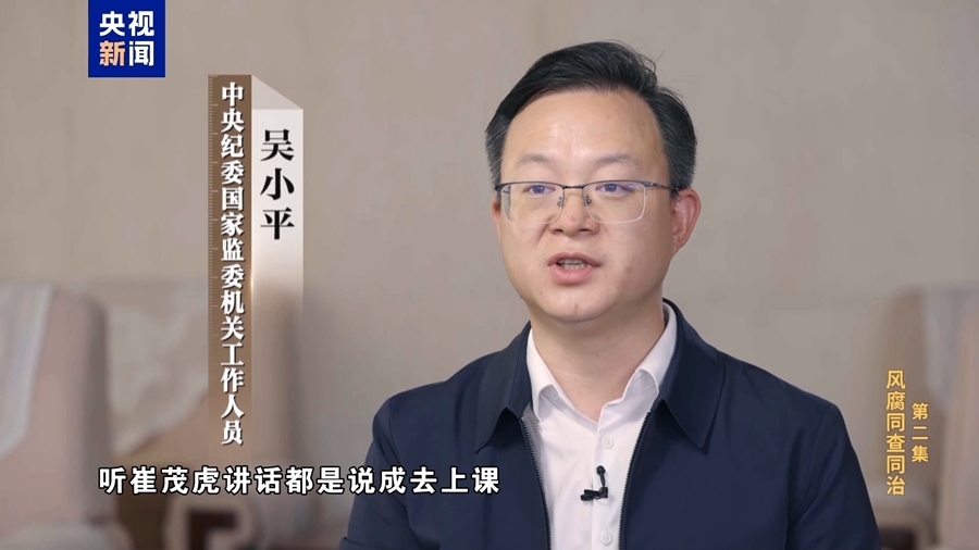 中央紀(jì)委國(guó)家監(jiān)委機(jī)關(guān)工作人員 吳小平:崔茂虎特別能講,講起工作來(lái)都是長(zhǎng)篇大論的,所以麗江當(dāng)?shù)匾恍└刹棵看稳ラ_(kāi)會(huì),聽(tīng)崔茂虎講話都說(shuō)成去上課,去聽(tīng)崔老師講課,實(shí)際上散了會(huì)就開(kāi)始到別墅里面跟商人老板在一起吃喝玩樂(lè)。