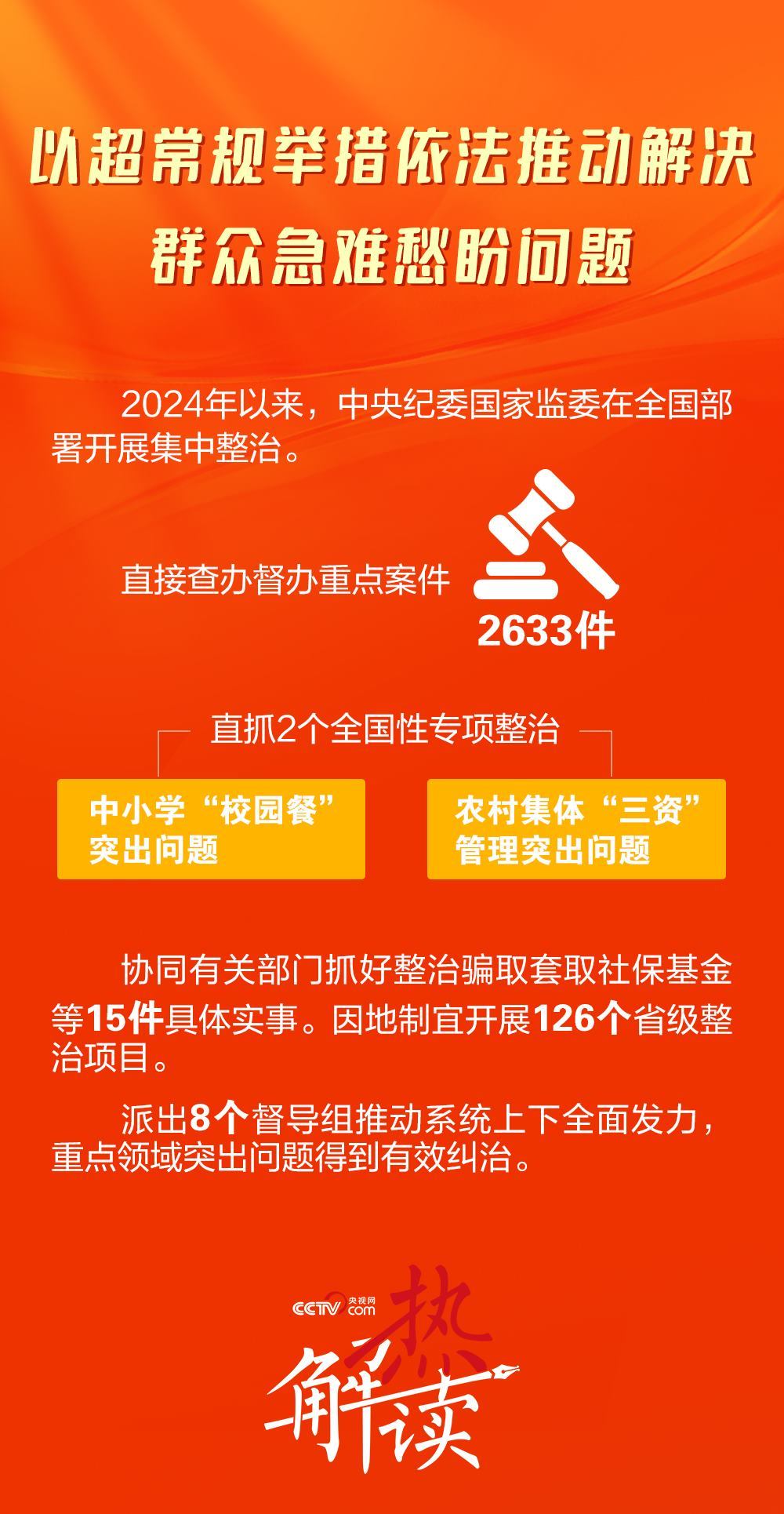2024年1月8日,在二十屆中央紀委三次全會上,習近平總書記明確要求懲治“蠅貪蟻腐”,讓群眾有更多獲得感。全會強調(diào)瞄準教育、就業(yè)、醫(yī)療等民生領域的痛點難點開展集中整治。此次召開的二十屆中央紀委四次全會,更加明確民生領域腐敗問題整治方向——聚焦“縣以下這一關(guān)鍵環(huán)節(jié)、薄弱環(huán)節(jié)”,直達正風肅紀反腐“最后一公里”。