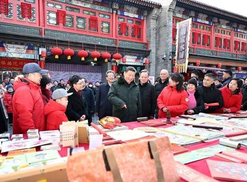 2024年春節(jié)前夕,總書(shū)記來(lái)到天津古文化街。在泥人張店鋪,他仔細(xì)觀看手藝人修復(fù)“孔子撫琴”的泥塑,感慨道:“一代代接續(xù)的工匠精神,讓文脈得以綿延不息?!痹诮诌叺臈盍嗄景婺戤?huà)店鋪,他端詳“勾、刻、印、繪、裱”道道工藝,贊賞道“連年有余,寄托了人們對(duì)美好生活的向往”。