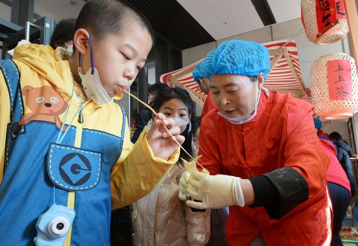 2025年1月29日,小朋友在位于北京的中國非物質(zhì)文化遺產(chǎn)館舉行的“過年——春節(jié)主題展”上體驗“吹糖人”。新華社記者 李賀 攝