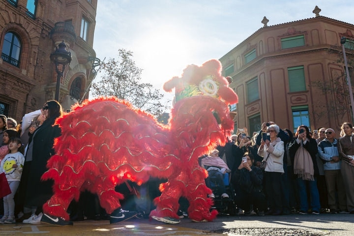 2025年1月25日,在西班牙巴塞羅那,演員在“與巴塞羅那共慶新春佳節(jié)”活動上表演舞獅。新華社發(fā)(胡安·戈薩攝)