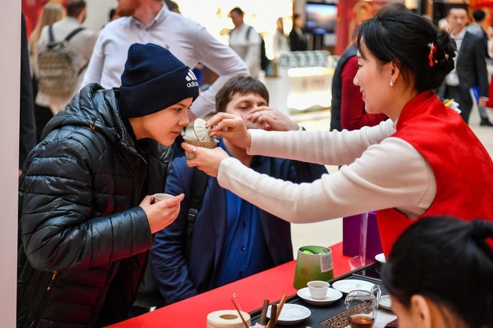 2025年1月28日,在俄羅斯莫斯科舉行的新春廟會活動上,游客在感受茶文化。新華社記者 曹陽 攝