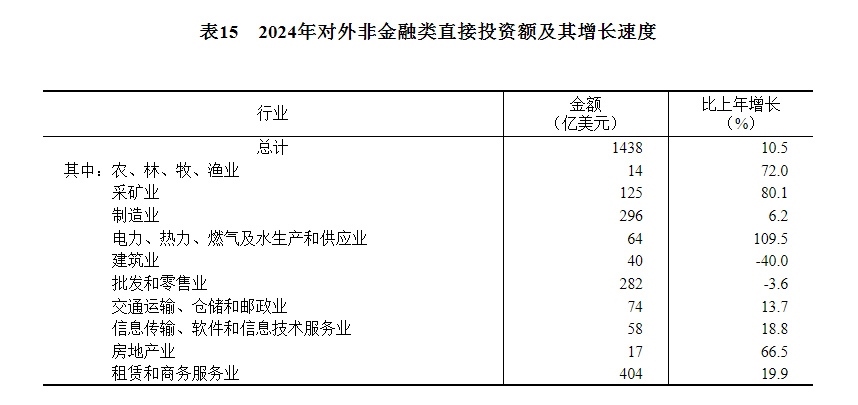 全年對(duì)外非金融類直接投資額10245億元,比上年增長(zhǎng)11.7%,折1438億美元,增長(zhǎng)10.5%。其中,對(duì)共建“一帶一路”國(guó)家非金融類直接投資額2399億元,增長(zhǎng)6.5%,折337億美元,增長(zhǎng)5.4%。