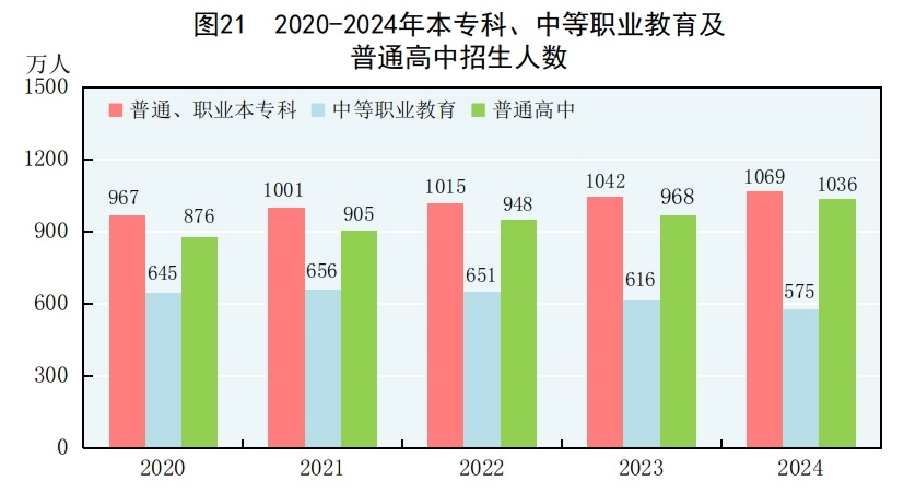全年研究生教育招生135.7萬(wàn)人,在學(xué)研究生409.5萬(wàn)人,畢業(yè)生108.4萬(wàn)人。普通、職業(yè)本??芠74]招生1068.9萬(wàn)人,在校生3891.3萬(wàn)人,畢業(yè)生1059.4萬(wàn)人。中等職業(yè)教育[75]招生575.4萬(wàn)人,在校生1659.4萬(wàn)人,畢業(yè)生542.2萬(wàn)人。普通高中招生1036.2萬(wàn)人,在校生2922.3萬(wàn)人,畢業(yè)生891.0萬(wàn)人。初中招生1848.8萬(wàn)人,在校生5386.2萬(wàn)人,畢業(yè)生1698.2萬(wàn)人。普通小學(xué)招生1616.6萬(wàn)人,在校生10584.4萬(wàn)人,畢業(yè)生1857.3萬(wàn)人。特殊教育招生15.8萬(wàn)人,在校生91.6萬(wàn)人,畢業(yè)生17.7萬(wàn)人。學(xué)前教育在園幼兒3584.0萬(wàn)人。九年義務(wù)教育鞏固率為95.9%,高中階段毛入學(xué)率為92.0%。