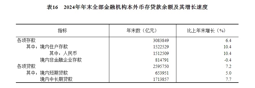 全年社會(huì)融資規(guī)模增量[52]32.3萬(wàn)億元,按可比口徑計(jì)算,比上年少3.3萬(wàn)億元。年末社會(huì)融資規(guī)模存量[53]408.3萬(wàn)億元,按可比口徑計(jì)算,比上年末增長(zhǎng)8.0%,其中對(duì)實(shí)體經(jīng)濟(jì)發(fā)放的人民幣貸款余額252.5萬(wàn)億元,增長(zhǎng)7.2%。年末全部金融機(jī)構(gòu)本外幣各項(xiàng)存款余額308.4萬(wàn)億元,比年初增加18.5萬(wàn)億元,其中人民幣各項(xiàng)存款余額302.3萬(wàn)億元,增加18.0萬(wàn)億元。全部金融機(jī)構(gòu)本外幣各項(xiàng)貸款余額259.6萬(wàn)億元,增加17.3萬(wàn)億元,其中人民幣各項(xiàng)貸款余額255.7萬(wàn)億元,增加18.1萬(wàn)億元。人民幣普惠小微貸款[54]余額32.9萬(wàn)億元,增加4.2萬(wàn)億元。本外幣涉農(nóng)貸款[55]余額51.4萬(wàn)億元,增加4.7萬(wàn)億元;制造業(yè)中長(zhǎng)期貸款余額14.0萬(wàn)億元,增加1.6萬(wàn)億元;綠色貸款余額36.6萬(wàn)億元,增加6.5萬(wàn)億元。