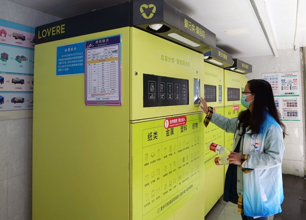 2023年5月23日,志愿者在上海市虹口區(qū)嘉興路街道愛家豪庭小區(qū)演示垃圾分類智能回收機(jī)的使用方法。