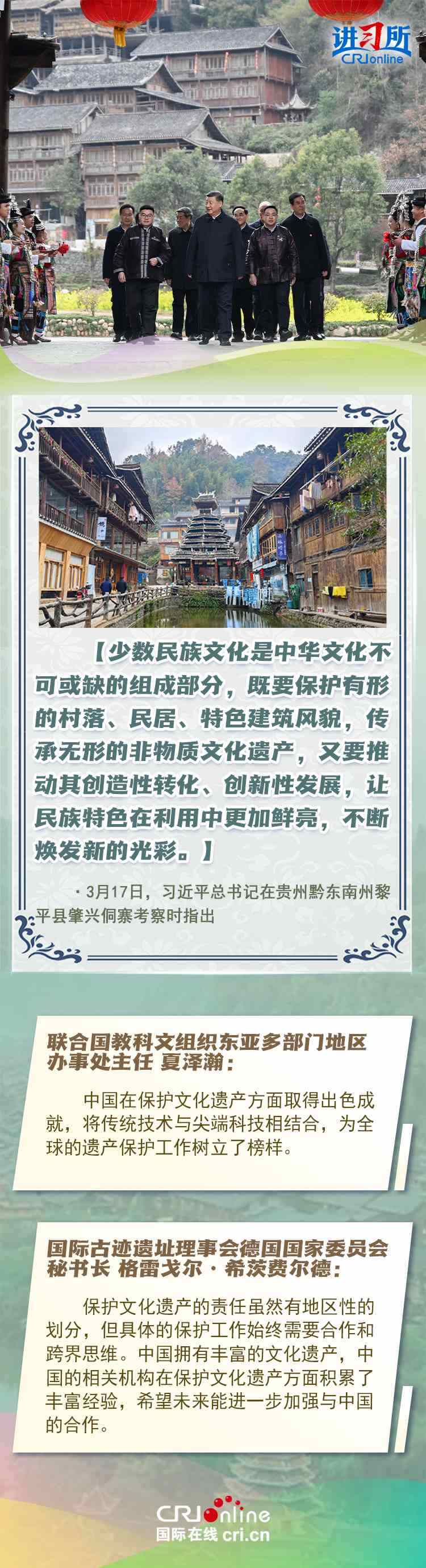 習(xí)近平總書記近日赴貴州、云南考察。他走進(jìn)民族特色村寨、歷史文化古城,心系歷史文化遺產(chǎn)保護(hù)和文旅融合發(fā)展。習(xí)近平特別叮囑當(dāng)?shù)毓賳T和群眾,既要保護(hù)有形的村落、民居、特色建筑風(fēng)貌,傳承無形的非物質(zhì)文化遺產(chǎn),又要推動(dòng)其創(chuàng)造性轉(zhuǎn)化、創(chuàng)新性發(fā)展。