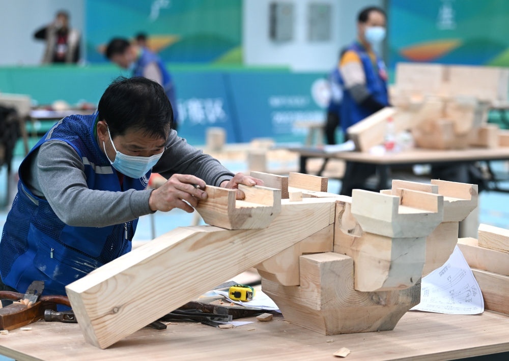 2023年3月25日,全國文物行業(yè)職業(yè)技能大賽在山西太原舉行,全國兩百余名選手現(xiàn)場比拼文物修復和考古探掘技術。這是參加木作文物修復師比賽項目的選手制作木質(zhì)傳統(tǒng)建筑構(gòu)件。