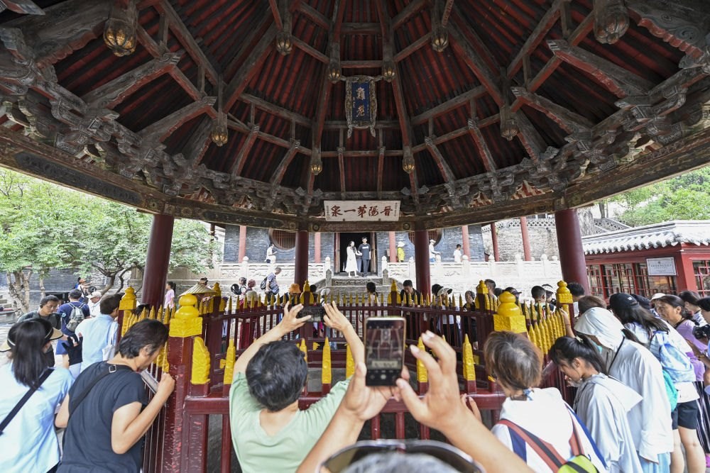 位于太原的晉祠,是祭祀西周初晉國首任諸侯唐叔虞的祠堂,是集中國古代祠祀建筑、園林、雕塑、壁畫、碑刻藝術于一體的珍貴的千年古祠,是首批全國重點文物保護單位之一。這是2024年7月25日,游客在晉祠博物館參觀。