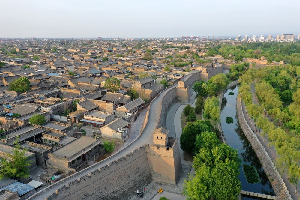山西平遙古城城墻和護城河一角(2024年5月9日攝,無人機照片)。近年來,當?shù)卣ㄟ^加固城墻、維護歷史建筑、逐步建立古城違建整治長效機制等措施,使這座“活著的古城”散發(fā)新的生機。