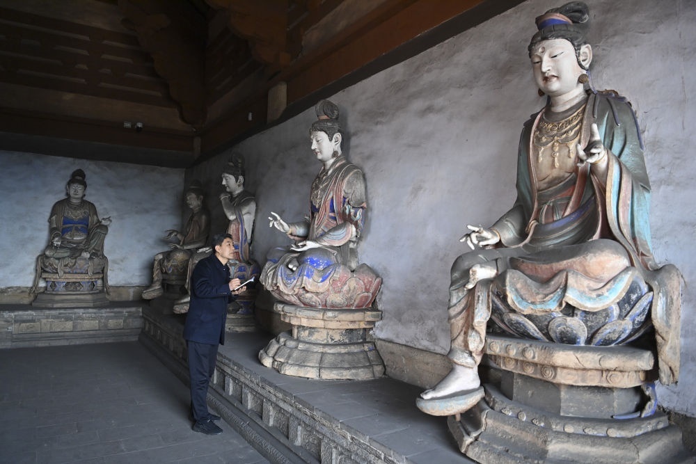 2024年3月16日,在山西長子縣法興寺圓覺殿,天王寺法興寺崇慶寺文物所副所長張宇飛記錄宋代彩塑的保存狀況。張宇飛從1993年開始擔任法興寺文保員,在日常講解之余,他通過查閱史料、研讀碑文、請教專家、走訪鄉(xiāng)民等方式,挖掘文物背后的故事,通過自媒體發(fā)表介紹山西文化遺產(chǎn)的原創(chuàng)文章百余篇。