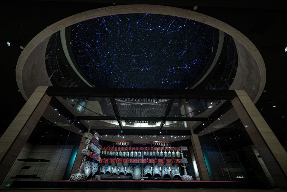 在湖北省博物館拍攝的隨州曾侯乙編鐘(2025年4月17日攝)。曾侯乙編鐘是我國(guó)出土數(shù)量最多、重量最重、音律最全、氣勢(shì)最為宏偉的一套編鐘,編鐘上的銘文是目前已知唯一的中國(guó)先秦官方音樂理論文獻(xiàn),以聲音和文字相互印證的方式保存了2400多年前人類的音樂記憶。